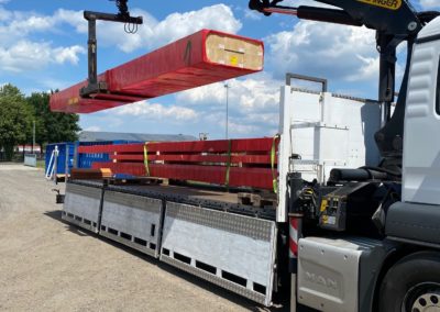 Das ist eine große Entlastung für unsere Kunden aus dem Handwerk. Der Handel mit Holz hat uns zu der Entwicklung unseres eigenen Langholz-LKWs inspiriert, der Latten, Balken und Platten mit einer Länge von bis zu 13 Metern problemlos transportieren kann.